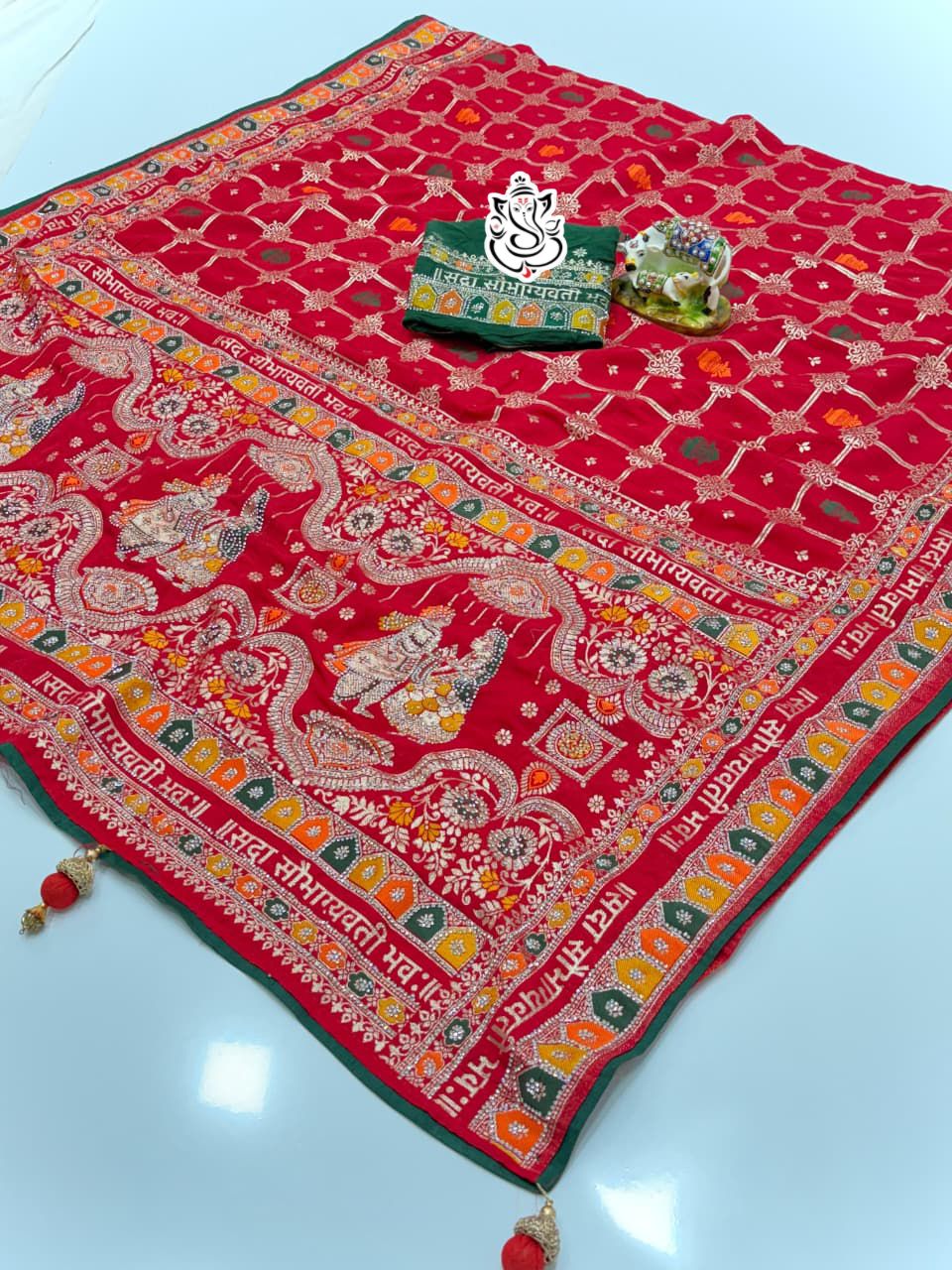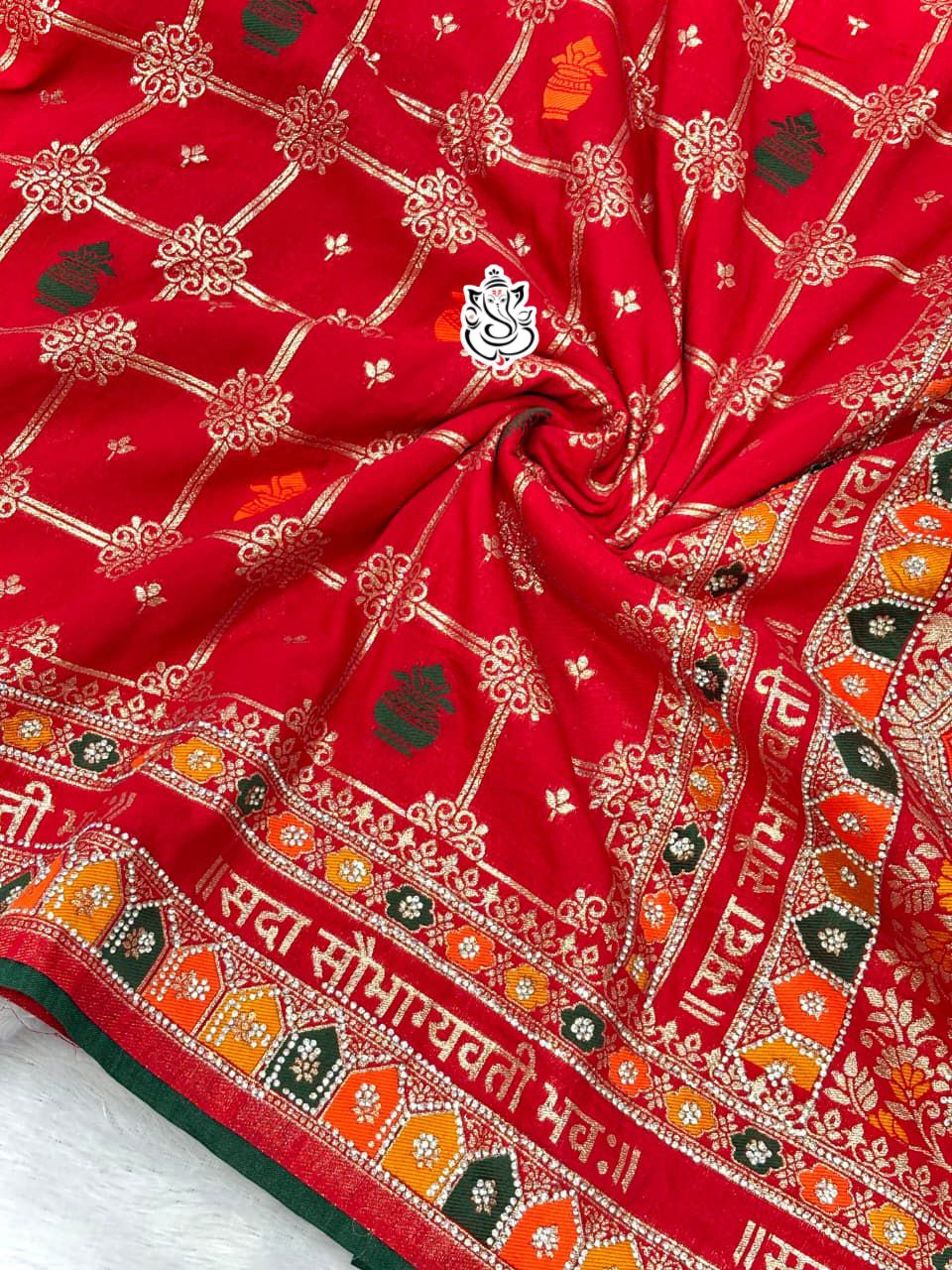 Discover the enchanting of Sada Saubhagyavati Bhava saree with beautiful dola silk weaving meena with rich pallu zarkhan work with running blouse